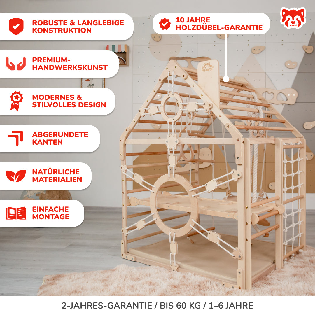 Machen Sie Ihr Wohnzimmer zur Abenteuerzone! Das Kinderzimmer Spielhaus verbindet einen Montessori-Kletterer mit einer gemütlichen Hütte – ein spielbereites Gym-Set für 1–6 Jahre, das alles für ganzjährige, spannende Indoor-Aktivität enthält.