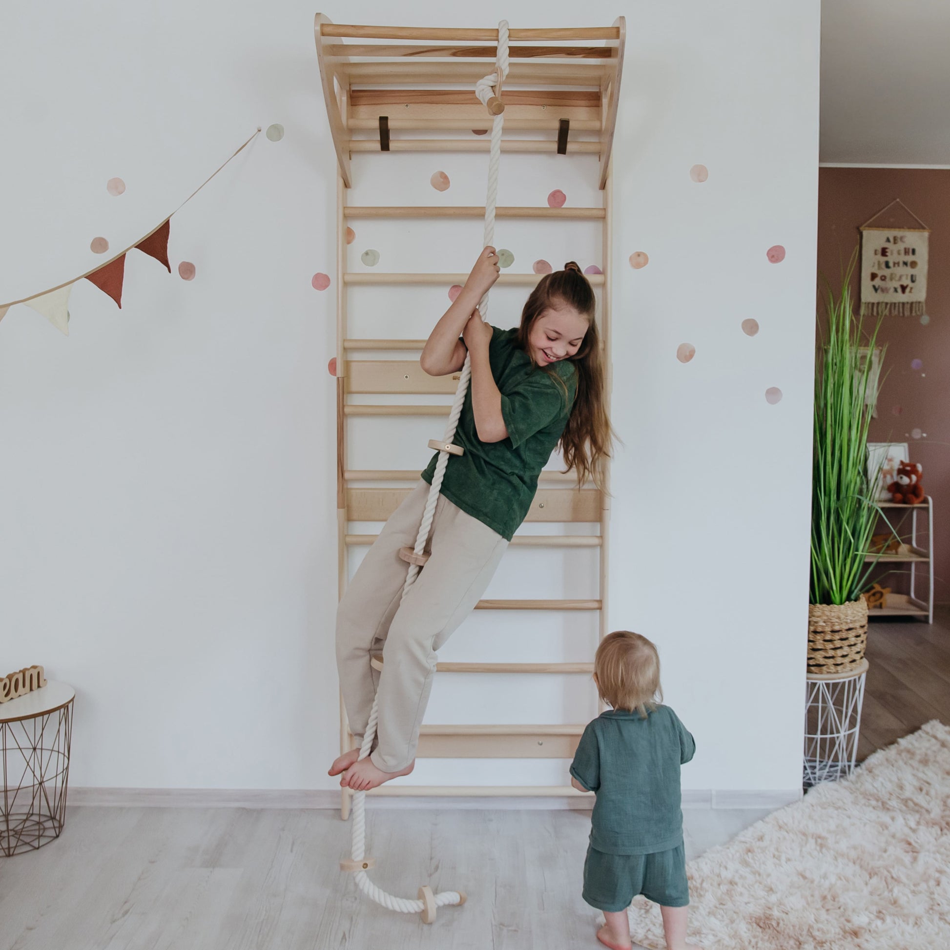 Das Seil mit 6 Holzkugeln ist perfekt für die Sprossenwand, die Kinderzimmer Turnwand sowie den Indoor Kletterturm geeignet.